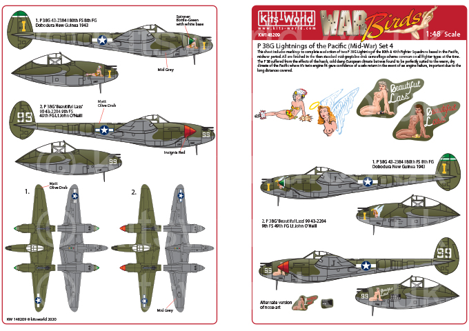 Kits-World - 1/48 Lockheed P-38 Lightning. This sheet includes markings to complete a selection of two P 38G Lightning's of the 80th & 49th Fighter Squadrons based in the Pacific, mid war period.
