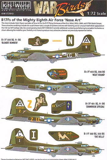 Kits-World - 1/72 Boeing B-17F Flying Fortress Nose Art from the Mighty 8th (8) LG-N 322nd Bs 91st Bg Blonde Bomber , RD-D 423rd Bs Meat Hound , LL-Z 401st Bs Shamrock Special , PU-I 360th Bs The Belle , WF-F 364th Bs Wolfess , LG-U 322nd Bs Warbash Canonball , FO-G 572nd Bs Vonnie Gal , RN-T 359th Bs The Duchess , All OD/Grey. Individual aircraft markings only.