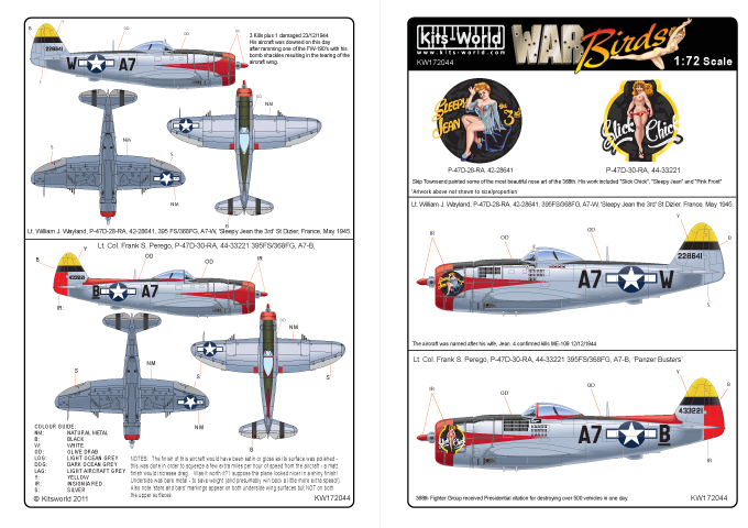 Kits-World - 1/72 Republic P-47D Thunderbolt 368th Fg 395th Fighter Squadron 'Sleepy Jean 3rd' A7-W P-47D-28-RA S/N 42-28641 Lt William J. Wayland 'Slick Chick' P-47D-30-RA, coded A7-B, S/N 44-33221 Lt Col Frank Perego