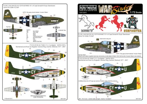 Kits-World - 1/72 North-American P-51B-1-NA Mustang (NA102) (2) 43-12375 FT-E Bonnie B II Capt Donald M 'Buzz' Beer bower 353rd FS/ 354th Fg 9th AF, P-51D-25-NA 44-73264 CY-U Gunfighter 343FS/ 55FG Warbird.