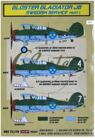 Kora Model - 1/72 Decals Gl.Gladiator J8 (Swedish) Part I.