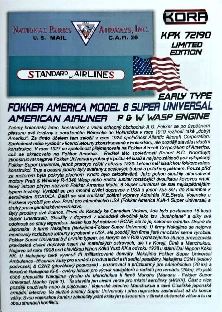 KORA MODEL - 1/72 Fokker America Model 8 Super Universal Early