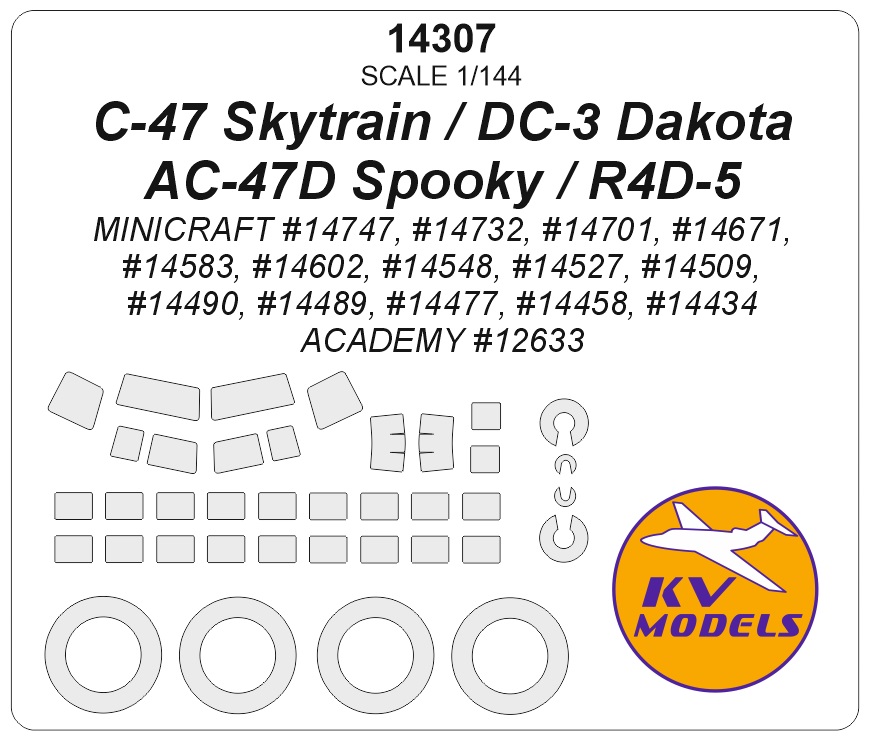 KV Decals - 1/144 Douglas C-47 Skytrain / DC-3 Dakota / AC-47D Spooky / R4D-5 ACADEMY Part12633 / Minicraft Part14747, Part14732, Part14701, Part14671, Part14583, Part14602, Part14548, Part14527, Part14509, Part14490, Part14489, Part14477, Part14458, Part14434 wheels and canopy frame paint masks outside only for Academy and Mincraft