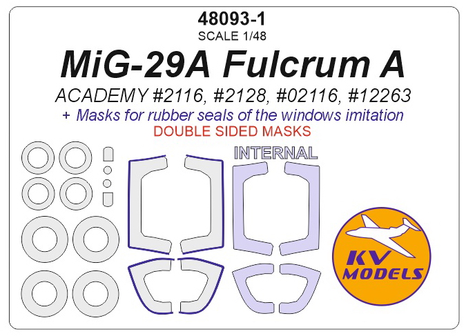 KV Decals - 1/48 Mikoyan MiG-29A Fulcrum A + wheels masks + Masks for imitation rubber seals of the windows are included Double sided for Academy kits ACA2116, ACA2128, ACA02116, ACA12263