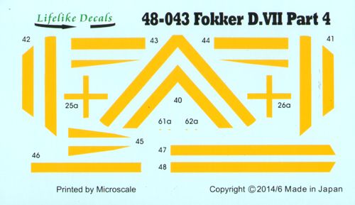 Lifelike - 1/48 Fokker D.VII's. Fokker D. VIIF, 4348/18 of Jasta Boelcke, November 1918. Fokker D.VII (OAW), 4499/18, flown by Vizeflugmeister Franz Mayer, MFJ III, August/September 1918. Fokker D. VIIF, 323/18F, flown by Vizefeldwebel Willy Gabriel, Jasta 11, late June 1918. Fokker D. VII (OAW), 2188/18 (?), flown by Ltn. Hans Koerner, Jasta 19, early 1918 to September 1918.
