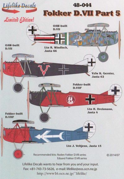 Lifelike - 1/48 Fokker D.VII's. Fokker D.VII (OAW), 2035/18, flown by Staffelfuehrer of Jasta 66, Ltn. Rudolf Windisch, late May 1918 Fokker D.VII (OAW), W. Nr. unknown, flown by Vizeflugmeister Karl Gerster, Jasta 62, October/November 1918. Fokker D.VII, W. Nr. unknown, flown by Ltn d.R. Heinrich Drekmann, July 1918. Fokker D.VII, W. Nr. unknown, flown by Staffelfuehrer of Jasta 15, Ltn. Josef Veltjens, July/August 1918.