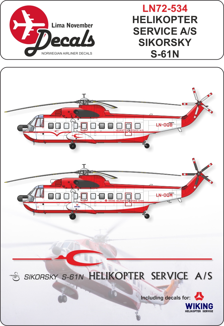 Lima November - 1/72 Helikopter Service Sikorsky S-61N first cs, includes decals for Wiking Helicopter Service. Includes masks