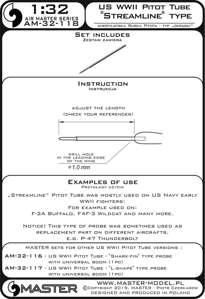 Master (PL) - 1/32 US WWII Pitot Tube Streamline type probe (1 pc) mainly used on US Navy early aircrafts (e.g. Brewster F-2A Buffalo, Grumman F4F-3 Wildcat) (for Special Hobby and Trumpeter kits)