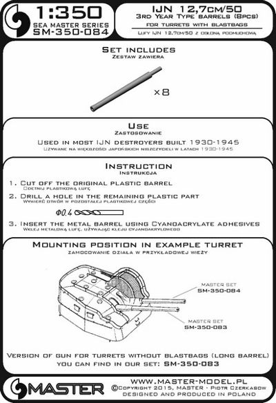 Master (PL) - 1/350 IJN 12,7cm/50 (5in) 3rd Year Type barrels - for turrets with blastbags (8pcs) - most IJN destroyers built 1930-1945