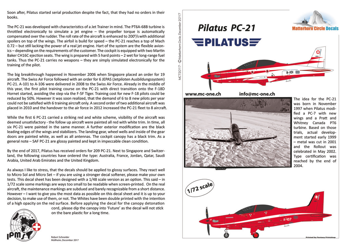 Matterhorn Circle - 1/72 Pilatus PC-21 Birth oft he PC-21 started in November 1997 when Pilatus modified a PC-7 with new wings and a Pratt and Whitney Canada PT6 turbine. Based on those trials, actual development started early 1999-metal was cut in 2001 and the Rollout was celebrated in May 2002. Type certification was reached by the end of 2004. Soon after, Pilatus started serial production despite the fact, that they had no orders in their books. The PC-21 was developed with characteristics of a Jet Trainer in mind. The PT6A-68B turbine is throttled electronically to simulate a jet engine-the propeller torque is automatically compensated over the rudder. The roll rate of the aircraft is enhanced to 2000/s with additional spoilers on top of the wings. The airfoil is build for speed-the PC-21 reaches a top of Mach 0.72-but still lacking the power of a real jet engine. Hart of the system are the flexible avionics-depending on the Jet the customer has in mind. The cockpit is equipped with two Martin Baker CH16C ejection seats. The wing is prepared with 5 hard points-2 wet for long-range fuel tanks. Thus the PC-21 carries no weapons-they are simply simulated electronically for the training of the pilot.