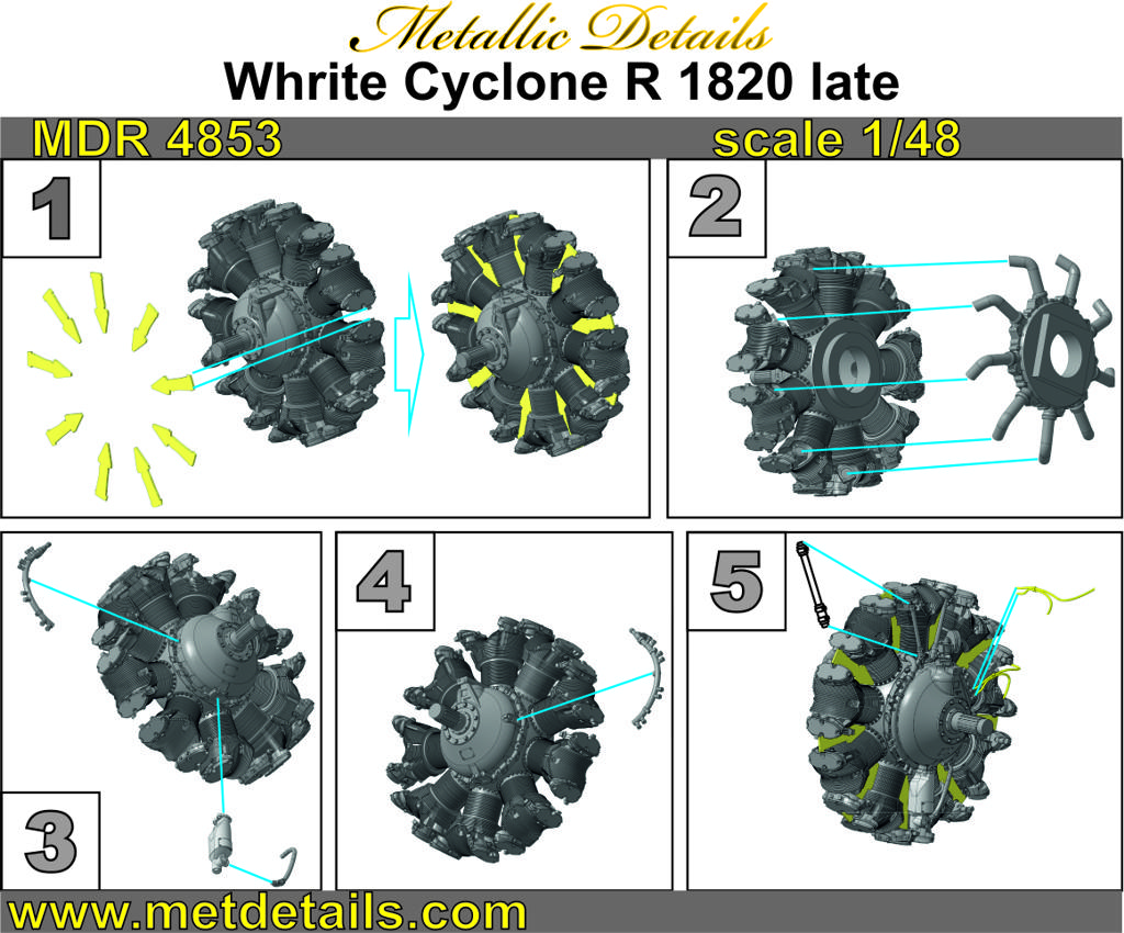 Metallic Details - 1/48 Wright R-1820 Cyclone late for Boeing B-17 Flying Fortress, Boeing 307, Brewster F2A, Curtiss AT-32-A Condor, Curtiss SBC-4 Helldiver, Curtiss P-36 Mohawk, Curtiss Sc Seahawk, Curtiss-Wright CW-21, Douglas A-33, Douglas B-18, Douglas DC-2, Douglas DC-3 (DST, G-102 and G-202), Douglas Super DC-3, R4D-8 / C-117, Douglas DC-5, Douglas Df Wright SGR-1820G-2, Douglas Sbd Dauntless, Fma AeMB.2 Bombi, General Motors FM-2 Wildcat, Grumman TF-1 / C-1 Trader, Grumman E-1 Tracer, Grumman FF, Grumman F3F, Grumman XF5F, Grumman XP-50, Grumman HU-16 Albatross, Grumman J2F Duck, Grumman S-2 Tracker, Lockheed 14, Lockheed Lodestar, Lockheed Hudson, Martin B-10, North American NA-44, North American O-47, North American P-64, North American T-28B/C/D Trojan, Northrop YC-125 Raider, Piasecki H-21, Polikarpov I-16, Ryan Fr Fireball, Sikorsky S-58/HUS/HSS/H-34.