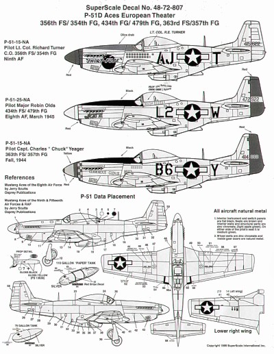 Microscale - 1/72 North-American P-51D Mustang Aces (3) 415622 AJ-T Lt.Col. Richard Turner CO 356FS/354FG 'Short Fuse' red spinner, 472922 L2-W Major Robin Olds 434FS/479FG red rudder, 414888 B6-Y Capt Chuck Yaeger 363FS/357FG 'Glamorous Glen III' red/yellow nose, red rudder. all natural metal