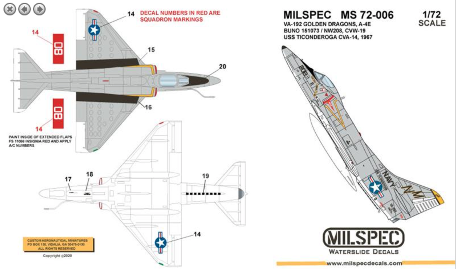 Milspec - 1/72 Douglas A-4ESkyhawk VA-192 Golden Dragons 1967. VA-192 Golden DRAGONS, A-4E, Buno 151073 / NM208, CVW-19, Uss Ticonderoga CVA-14, 1967