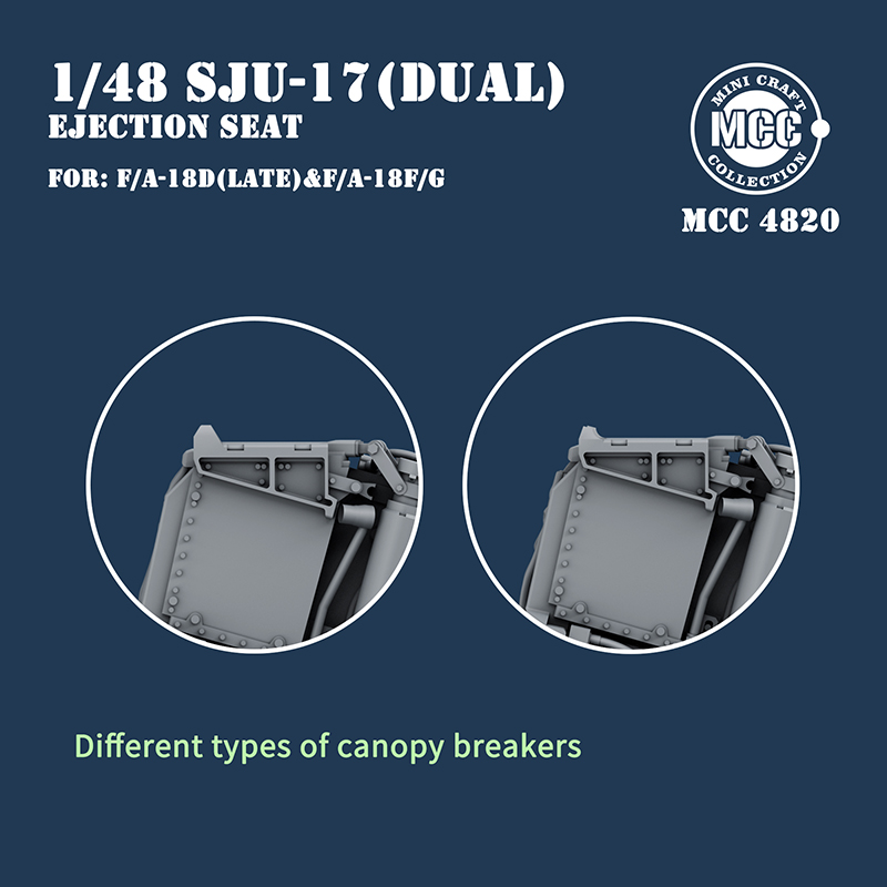 Mini Craft Collection - 1/48 SJU-17 Naces Ejection Seats for Boeing F/A-18F/G & F/A-18D Late 2pcs. 1 pcs SJU-17V2/A Front Seat and 1 pcs SJU-17V9/A Rear Seat Naces Ejection Seats for F/A-18F Super Hornet, EA-18G Growler, F/A-18D Hornet Late version, Front and rear seats have different details and seats belt styles. All parts are 3D-printed. Fits all brands