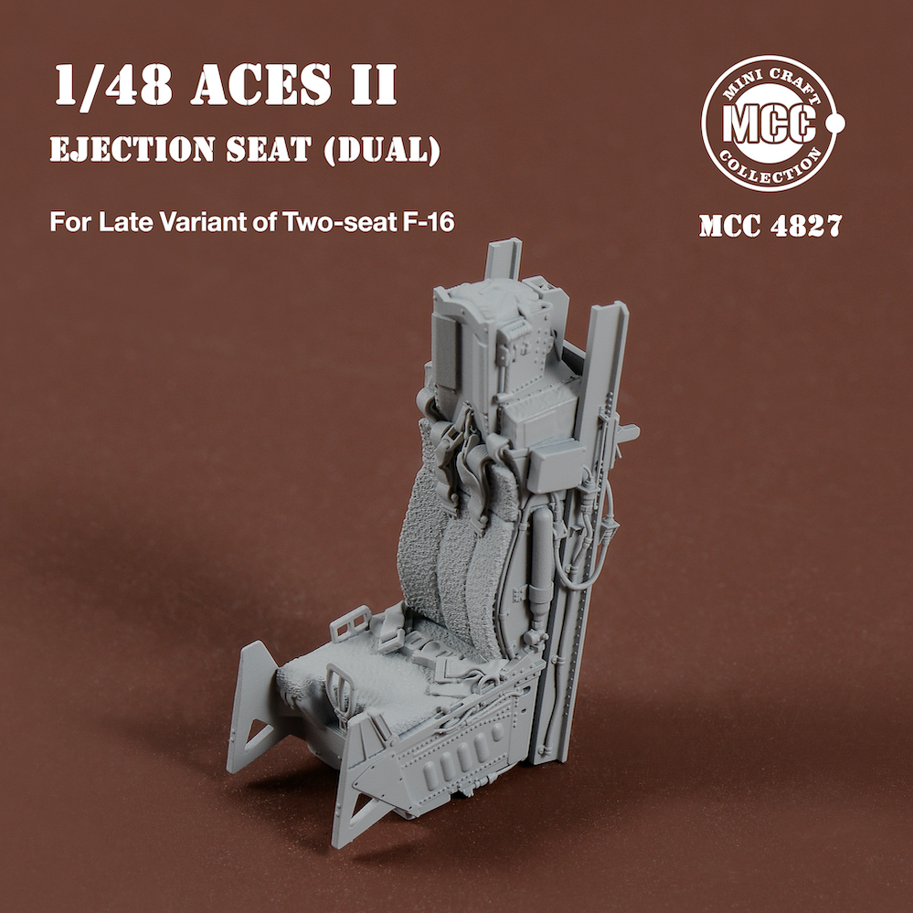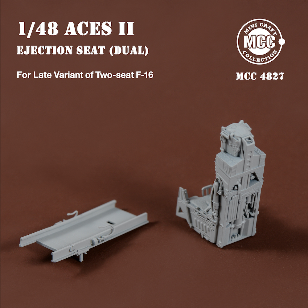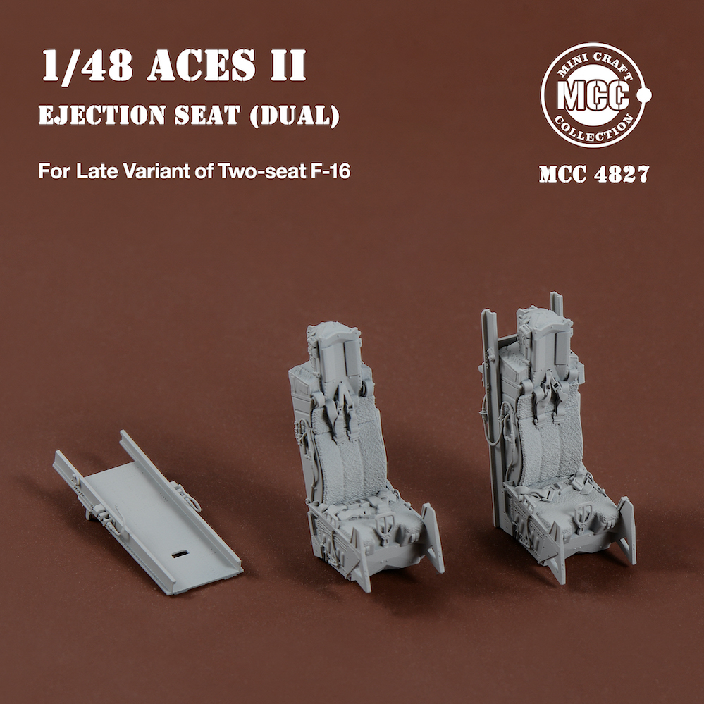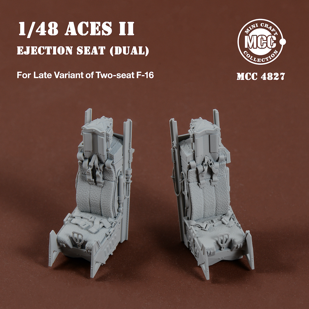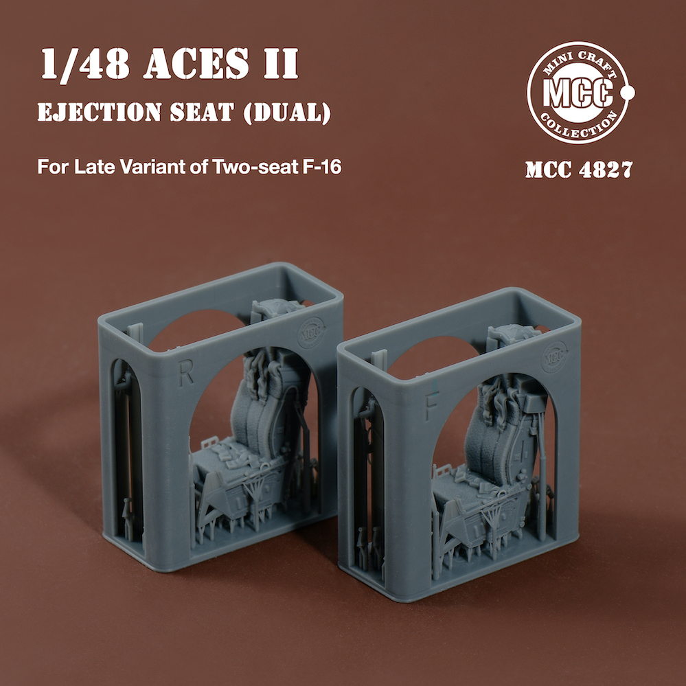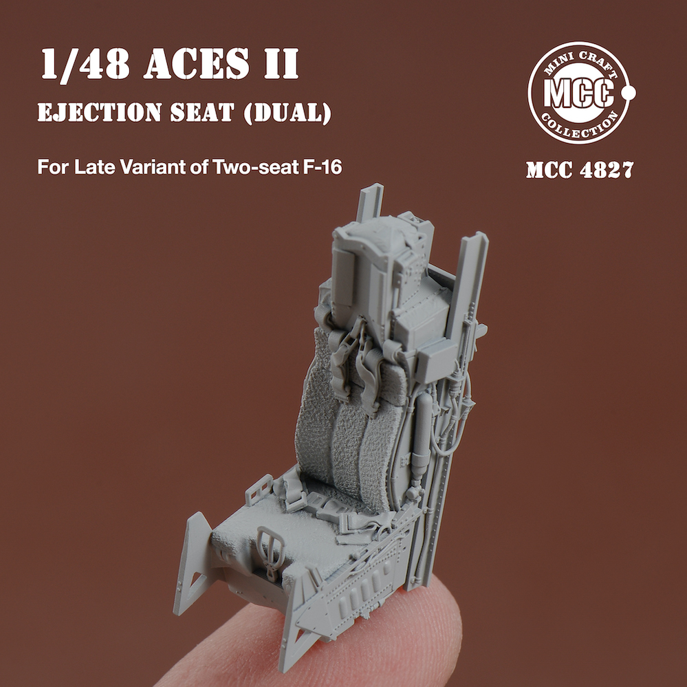 Mini Craft Collection - 1/48 Aces II Ejection Seats for F-16 Two-seat Variant Late 2pcs. 2 pcs Aces II ejection seats for F-16 two-seat variant late type, wool pad. Front and rear seats have different details and seat belt styles. All parts are made by 3d-printed. Fits all brands