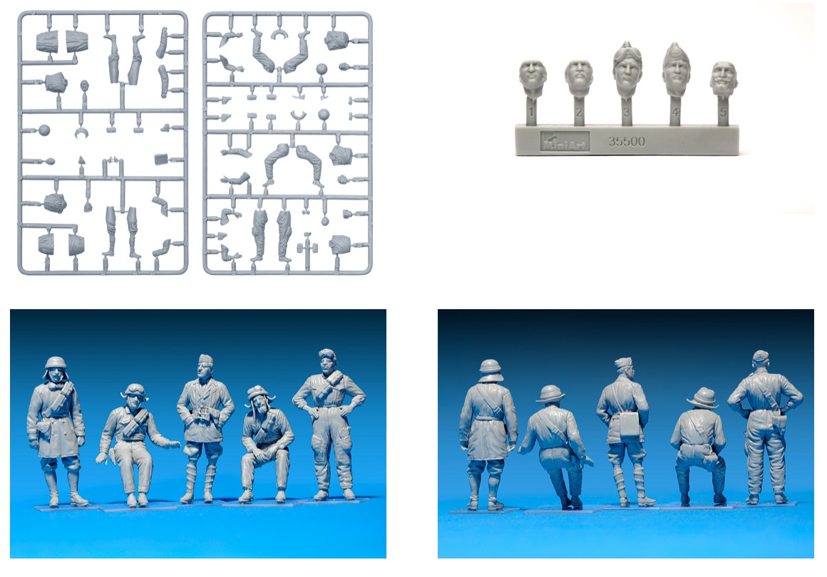 this kit includes five highly detailed figures of italian tank crew members from world war II, each featuring resin heads for realistic facial expressions. The figures are dressed in a mix of uniforms, suitable for different climates and campaigns.