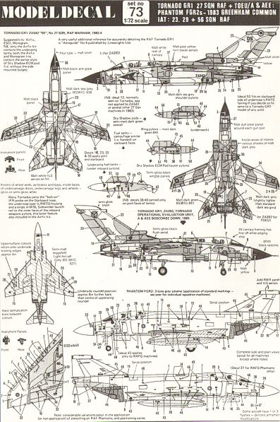 Modeldecal - 1/72 RAF Panavia Tornado GR.1 ZA542/05 27 Sqn Marham 1983,ZA392 TOEU Boscombe Down 1983, McDonnell-Douglas FGR.2 Phantom XV501/B Greenham Common 1983 or KV464/B Falklands 1983 both 23 Sqn, V406/D 29 Sqn Conningsby,XT901/Y 56 Sqn Wattisham, all 3 tone grey,