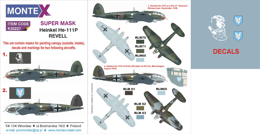 Montex - 1/32 Heinkel He-111P 2 canopy masks (exterior and interior) + insignia and markings masks + decals (for Revell kits)