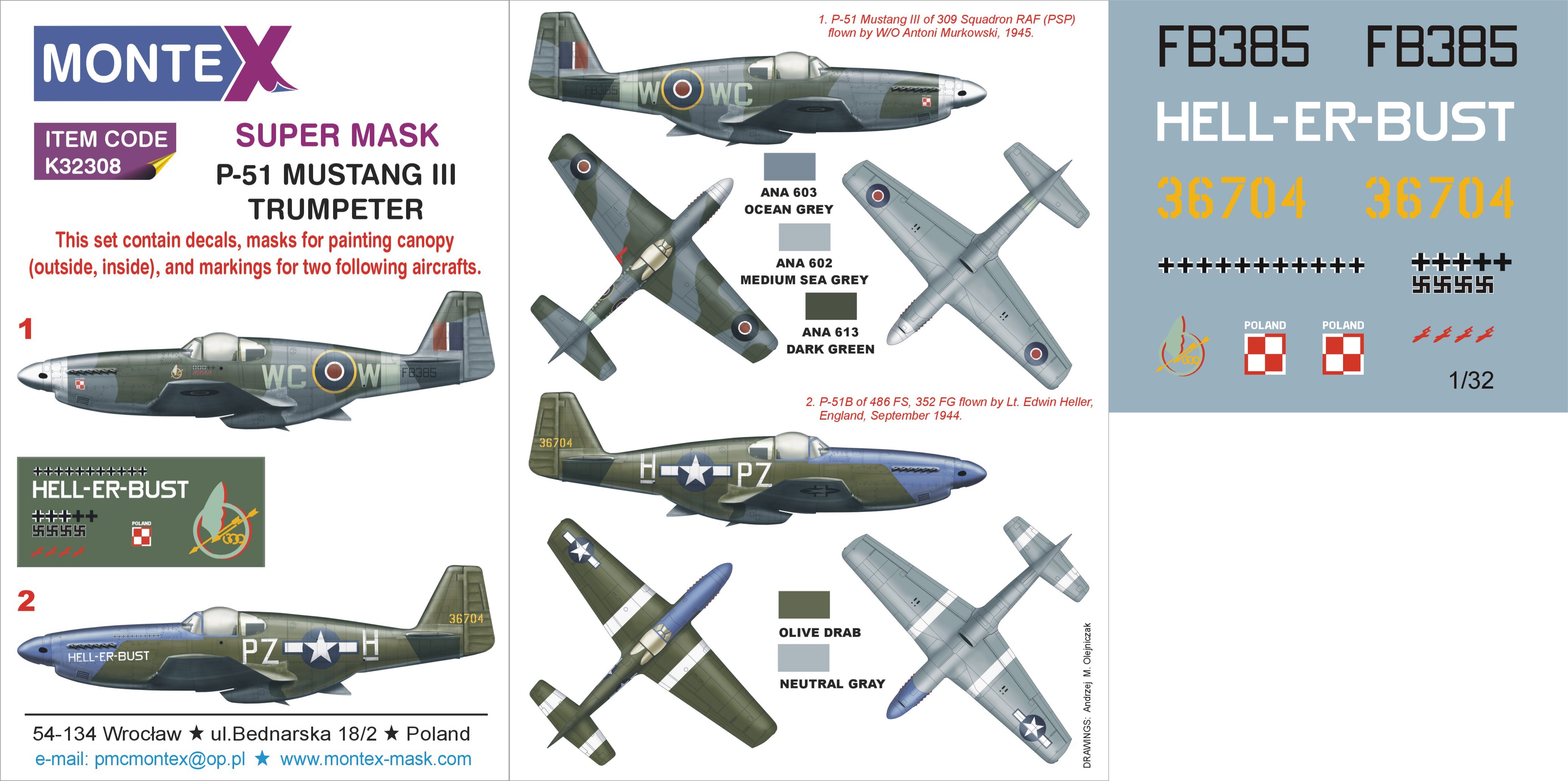 Montex - 1/32 North-American P-51B Mustang III (RAF,USAAF) (for Trumpeter kits) 2 canopy masks (outside and inside canopy masks) + 3 insignia masks + decals