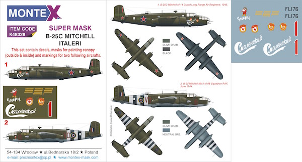 Montex - 1/48 North-American B-25C Mitchell (for Italeri kits) 2 canopy mask (outside & inside) + 2 insignia masks + decals
