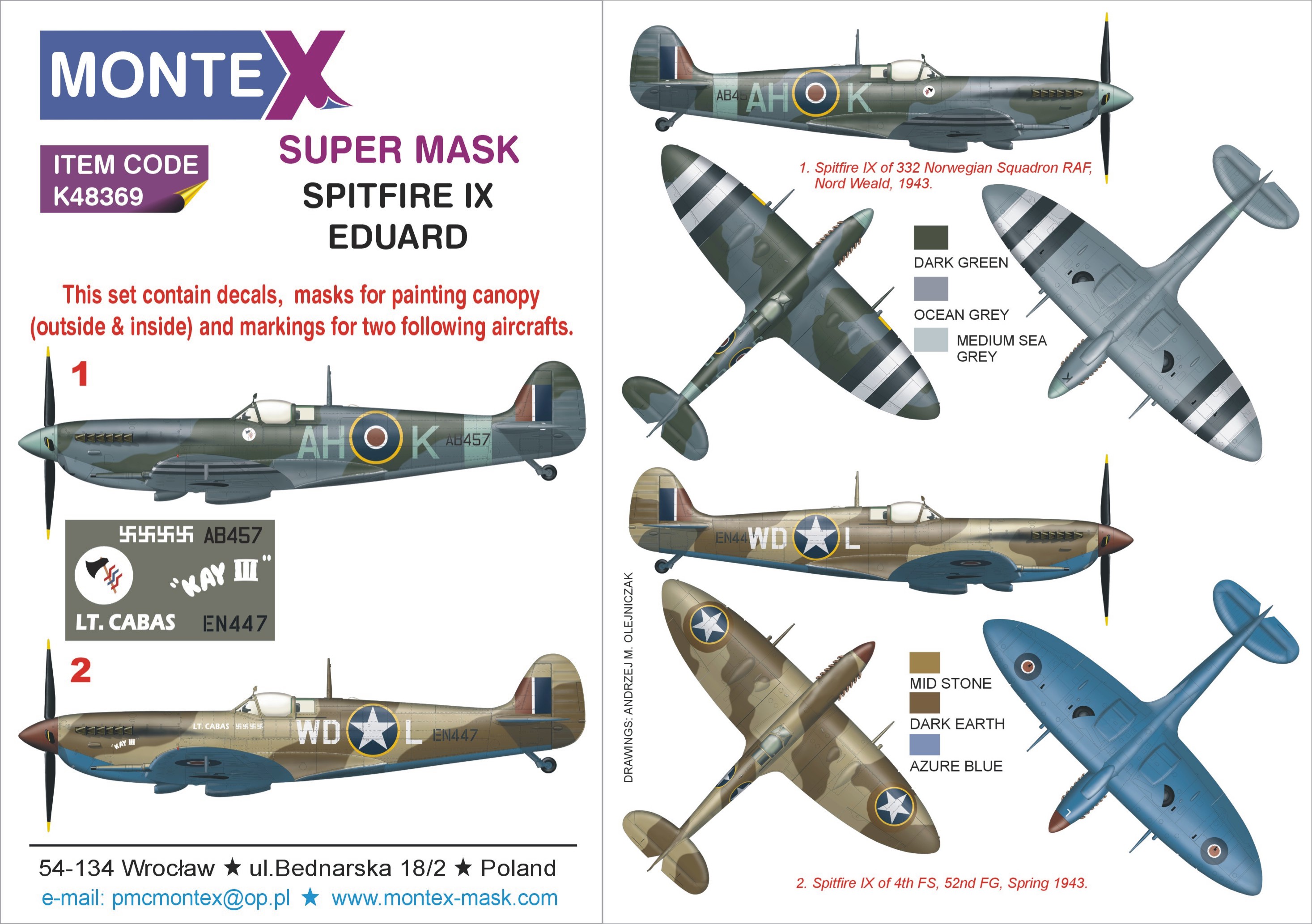 Montex - 1/48 Supermarine Spitfire Mk.IXc/Mk.IXe (for Eduard kits) canopy mask (outside & inside) + 2 insignia masks + decals
