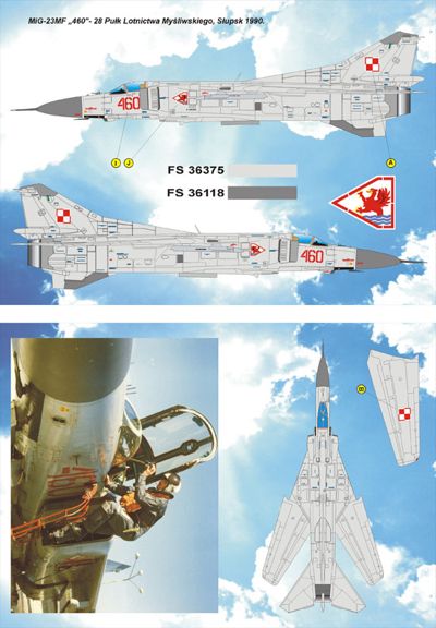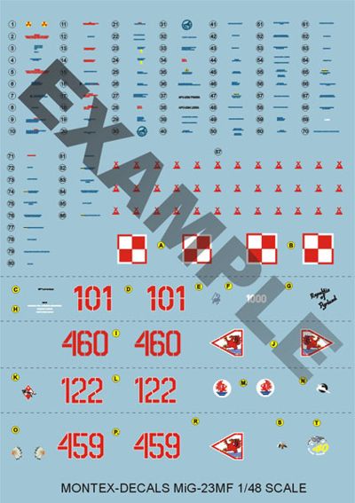 Montex - 1/48 Mikoyan MiG-23MF 1 decals sheet for 4 aircraft, exploational inscriptions with scheme of location, national and squadrons insignia, brochure with pictures of originals and 4-view color drawings (14 pages A5), mask for painting canopy for Italeri model