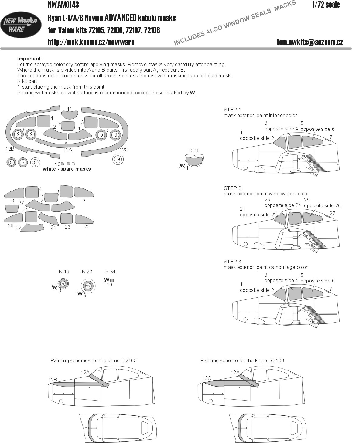 New Ware - 1/72 Mask Ryan L-17A/B Navion ADVANCED for aircraft canopy including window seals, wheels, nose, black antireflex area in the front of the aircraft canopy (for Valom kits)