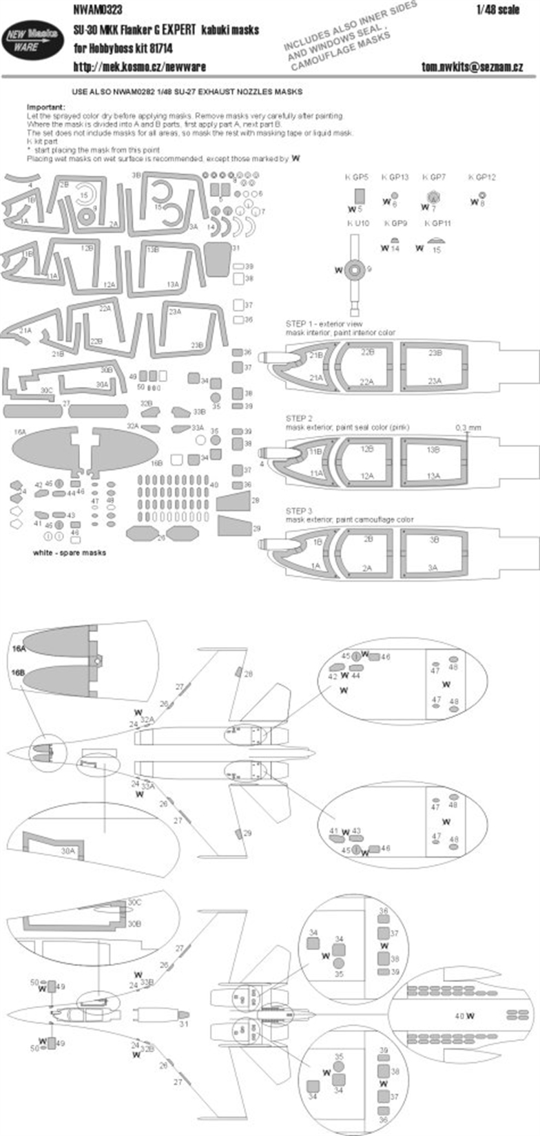 New Ware - 1/48 Sukhoi SU-30MKK Flanker-G EXPERT kabuki masks aircraft canopy including window seals and inner side masks, other clear parts and lights, surface panels, camouflage details. (for Hobby Boss kits)