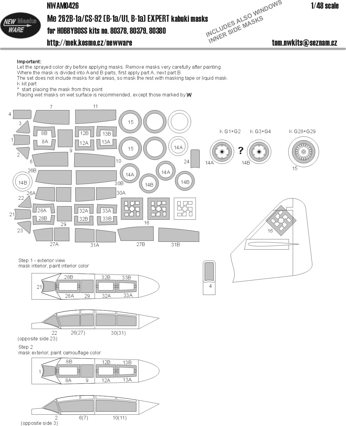 New Ware - 1/48 Messerschmitt Me-262B-1a/ Me-262B-1a/U1/Me-262B-1a/Avia CS-92 EXPERT kabuki masks aircraft canopy including inner side masks, wheels, svastikas (for Hobby Boss kits)
