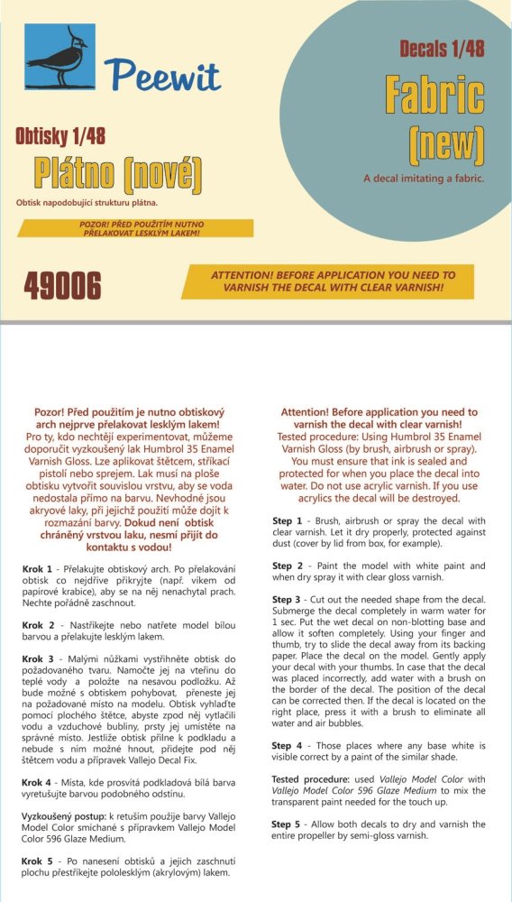 Peewit - 1/48, 1/72 Fabric (Lighter variant for new aircraft) (this decal must be varnished before it is used)