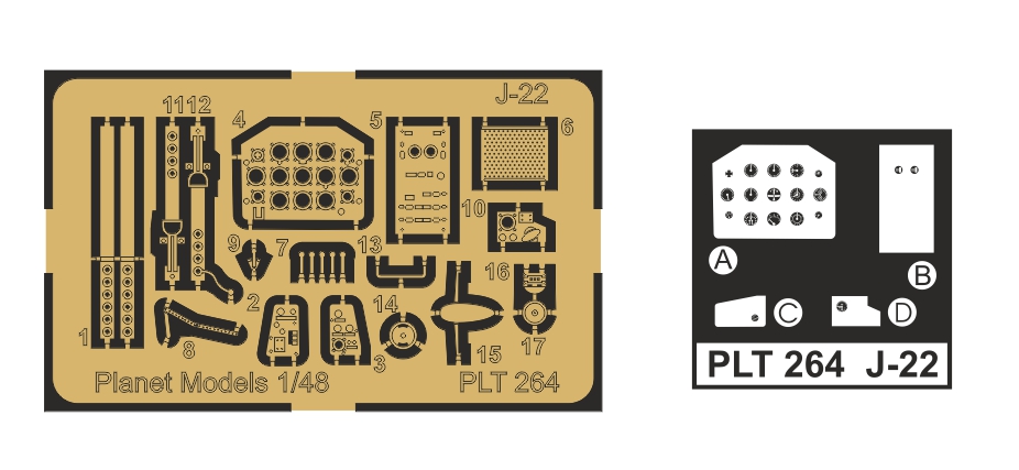 The kit contains nicely detailed resin parts with a PE-fret, white metal undercarriage legs and a decal sheet with markings for two J-22A machines. One of them is adorned with white stripes on its fuselage and wings which were used to mark aircraft taking part in an military exercise. The other kit option is embelished with a unit's badge in a form of a figure of the devil. The canopy is vacuum formed and the armoured glass situated in front of the pilot is made of clear resin.