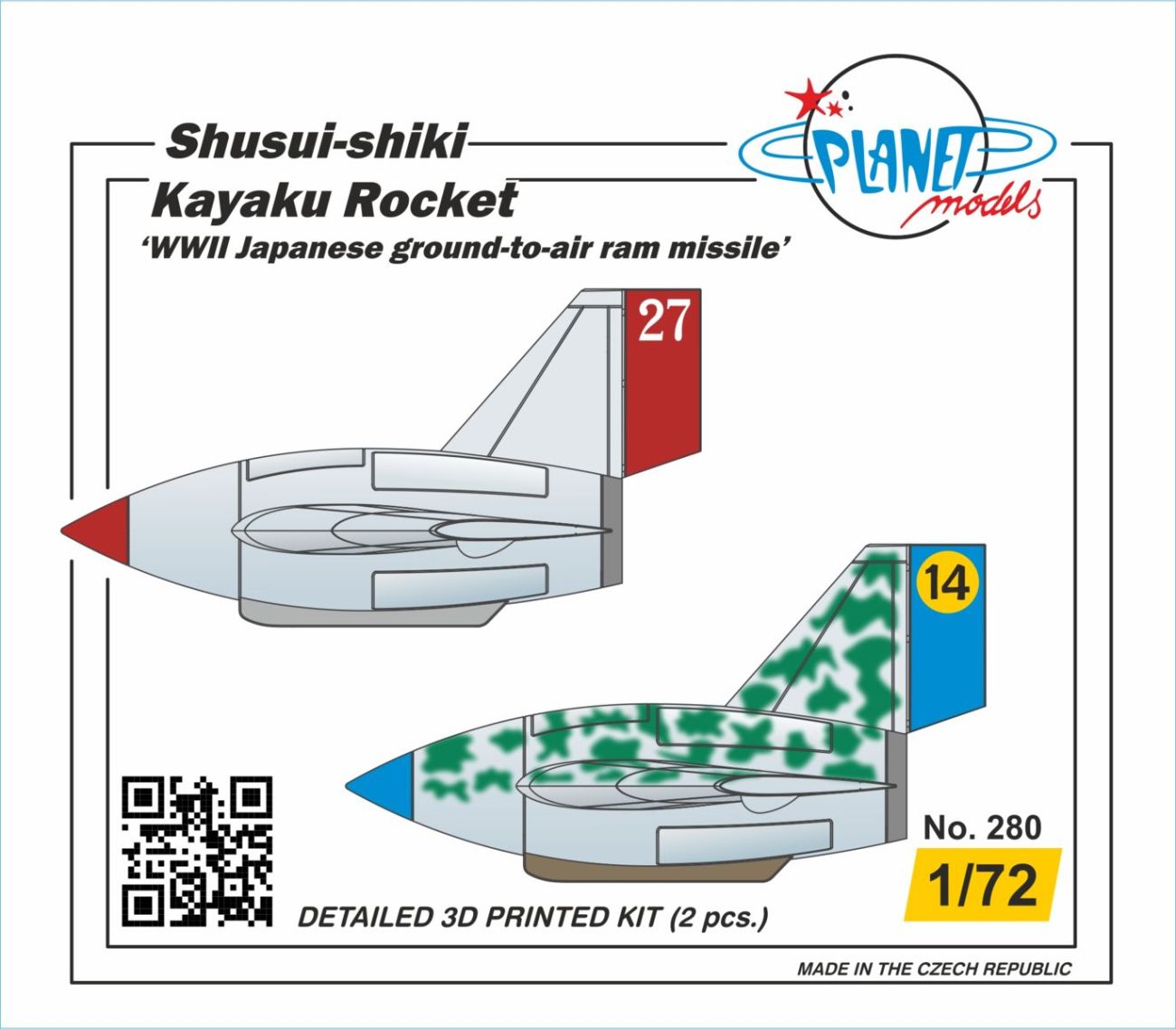 Planet - 1/72 Shusui-shiki Kayaku Rocket 'WWII Japanese ground-to-air ram missile' 2 pcs 3D-printed parts of this set portray the Japanese project of ram missiles planned to destroy the high flying B-29 bombers or other similar targets. The kit contains two missiles and their transport trolleys.