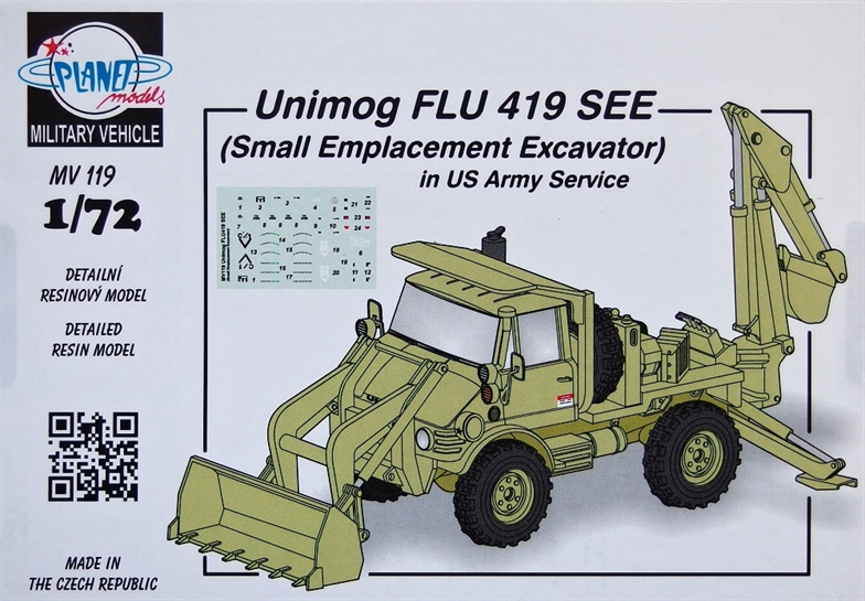 Planet - 1/72 Unimog FLU 419 SEE US Army. Full resin kit of a truck with dozer blade and spoon excavator. FLU 419 SEE was custom produced for the US Army and US Marine Corps. The truck were combat deployed to Kuwait and Afghanistan. The kit contains decals and plotter cut foil windows.