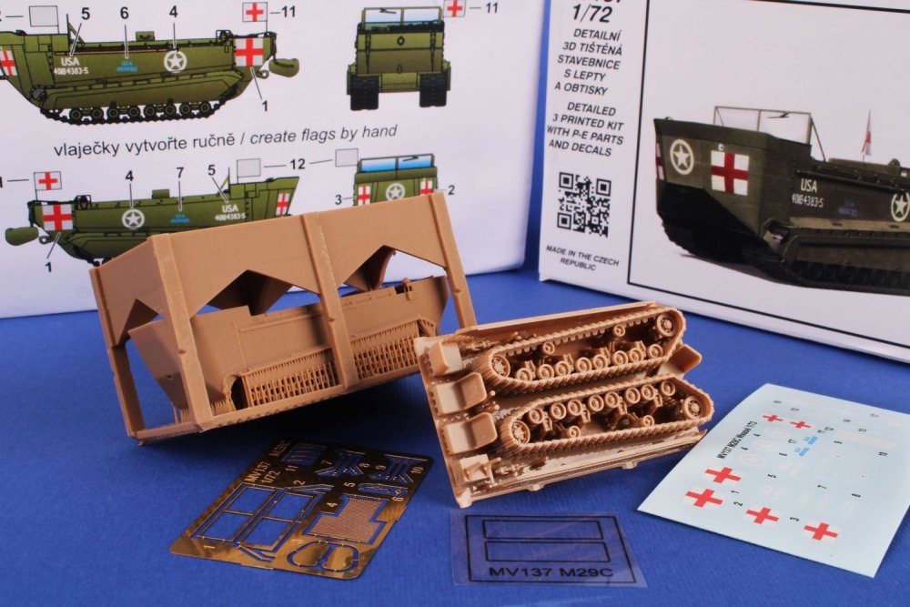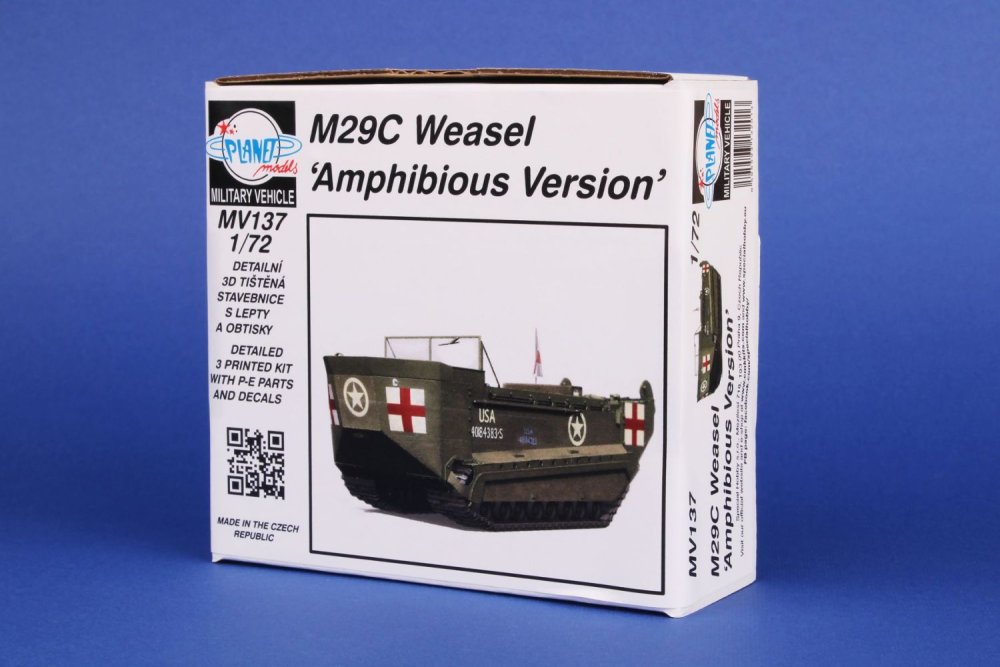 Planet - 1/72 M29C Weasel 'Amphibious Version' 3D-printed model set with etched details and a sheet of decals. This amphibious version of the US-built M29C Weasel tracked transport vehicle was used both in Europe and the Pacific Area during WW2, by American troops and Brits as well. The vehicles were also deployed to Korea and later used by the French in Vietnam.