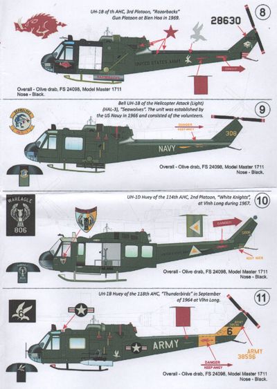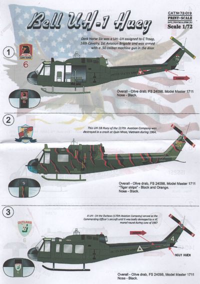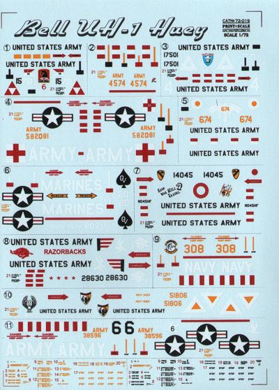Print Scale - 1/72 Bell UH-1B/UH-1D Huey (11) C Troop 16th Cavalry, 227th Aviation Company Tiger Striped, 175th Aviation Company, 57th Medical Detachment, 116th Assault Helo Co, 1st Platoon Battery C, 3rd Platoon 'Razirbacks', 114th Ahc White Knights, 118th Ahc Thunderbirds, 155251 U.S. Marines, Usn HAL-3 Seawolves. All Vietnam.