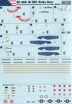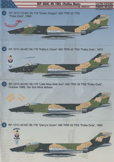 Print Scale - 1/72 Scale McDonnell RF-101C Voodoo. The long-nosed RF-101C Voodoo was the first combat aircraft in Southeast Asia as part of an operational unit in October 1961. The Voodoo did a superb job of photographing the Pathet Lao and Viet Cong. The RF-101C's speed made it largely immune to MiG interception. The Voodoos perform a complex missions in some 35,000 sorties over 9 years, 39 RF-101C aircraft were lost, 33 in combat including five to SA-2 Guideline SAMs, one to an airfield attack, and one in air combat to a MiG-21 in September 1967. 27 of the combat losses occurred on reconnaissance missions over North Vietnam. RF-101C Voodoo wears standard T.O. 1-1-4 Sea camouflage and the white Ah tail code assigned to the 45th Trs 'Polka Dots', part of the 460th TRW, at Tan Son Nhut. In 1970, RF-101 were replaced by new RF-4C