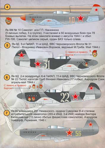4. Yak-9M flown by soviet ace pilot G.L. Nakaznyuk. (5 personal and 5 group victories. Participated in 60 aerial combat in 78 sorties). This aircraft was flown Nakaznyuk from August 1944 and shot down a Fw-190. The aircraft was gray on all surfaces. The emblem of the Orden of the Battle Red Banner was only on the port side.