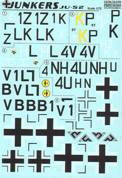 Print Scale - 1/72 Junkers Ju 52/3M 1. Ju 52/3m, 2nd snd squadron of 1/KGzbV.I, Southern Greece, May 1941 2. Ju 52/3m g7e, 4V+HL, 3./kgRZBV 9, Eastern Front, 1941 3. Ju.52/3m, 6th squadron of II/TG.2, Mediterranean, 1943 4. Ju 52/3m g4e, 4U+NH, allocated to 2. (F)/123,Derna, Northern Africa, June 1941 5. Among the Ju 52/3m g7es assigned to the VII. Fliegerkorps (7th Air Corps) was this aircraft (V1+LP). The Corps operated on the Eastern Front during the winter of 1943-44 WARNING: THERE IS AN ERROR ON ONE SWASTIKA ON TAIL, IT IS ON WRONG SIDE. IF YOU PURCHASE IT, THERE WILL BE NO EXCHANGE OR SPARE PART FOR THIS ERROR. YOU CAN USE THE OTHER DECALS WITHOUT ANY PROBLEM