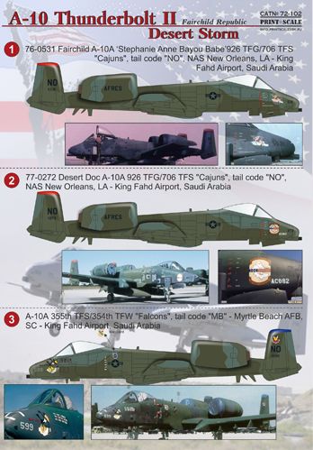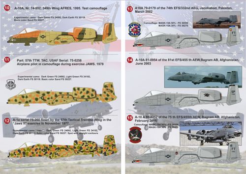 Print Scale - 1/72 Republic A-10 Thunderbolt II 1. 76-0531 Fairchild A-10A 'Stephanie Anne Bayou Babe'926 TFG/706 TFS "Cajuns", tail code "NO", NAS New Orleans, LA - King Fahd Airport, Saudi Arabia. 2. 77-0272 Desert Doc A-10A 926 TFG/706 TFS "Cajuns", tail code "NO", NAS New Orleans, LA - King Fahd Airport, Saudi Arabia. 3. A-10A 355th TFS/354th TFW "Falcons", tail code "MB" - Myrtle Beach AFB, SC - King Fahd Airport, Saudi Arabia. 4. 79-0112 Here Comes the Judge A-10A 355th TFS/354th TFW "Falcons", tail code "MB" - Myrtle Beach AFB, SC - King Fahd Airport, Saudi Arabia. 5. 79-0096 Honey Buns - left Wicked Sensation - rigth 61 missions A-10A 353rd TFS/354th TFW "Panthers", tail code "MB" - Myrtle Beach AFB, SC - King Fahd Airport, Saudi Arabia. 6. 78-0582 Alligator Leased from 46th TFTS "BD" A-10A 926 TFG/706 TFS "Cajuns", tail code "NO", NAS New Orleans, LA - King Fahd Airport, Saudi Arabia. 7. A-10A 81-0964 was flown by Captain Todd "Shanghai" Sheehy of the 511th TFS in Jan 1991. 8. Fairchild Republic A-10A Thunderbolt II 80-0219 509th TFS, 10th TFW, USAF. 9. Fairchild A-10A Warthog 77-0271 706TFS "Cajuns" / 926FG on display at Moody AFB, Georgia in 1992. Shortly afterward she was sent to the 309th AMARG "Boneyard" at Davis-Monthan AFB, Arizona. 10. A-10A Nr.74-552, 349th Wing AFRES, 1995. 11. Part: 57th TTW, TAC, USAF Serial: 75-0258. Airplane pilot in camouflage during exercise JAWS 1978. 12. A-10a serial 75-260 flown by the 57th Tactical Training Wing in the "Jaws ll" exercise in November 1977. 13. A-10A 79-0179 of the 74th EFS/332nd AEG, Jacobabad, Pakistan, March 2002. 14. A-10A 81-0954 of the 81st EFS/455 th AEW,Bagram AB, Afghanistan, June 2003. 15. A-10 A 80-0252 of the 75 th EFS/455th AEW, Bagram AB, Afghanistan, February 2005.
