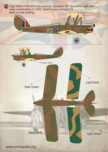 10. Tiger Moth ll Em 973 was used by Canadian 401 Squadron with unit code combination in 1943. Shark's jaws showed it's teeth on the cowling.