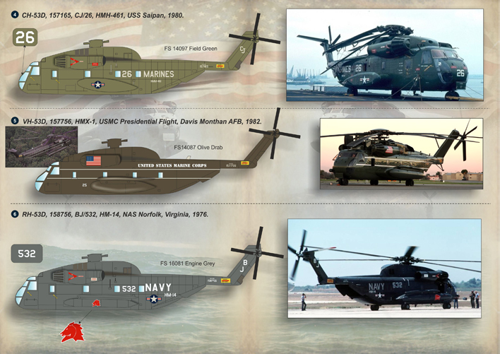 Print Scale - 1/72 Sikorskky S-65 Sea Stallion Part 2 / 72-135 / 1. RH-53D, 9-2704 (704), Tehran, Iran 2009. 2. CH-53D, 157139, YH-12, HMH-463, MCAS Kaneohe Bay, Hawaii 1982. 3. CH-53D, 157736, EH/22, HMH-264, USS Saipan, 1982. 4. CH-53D, 157165, CJ/26, HMH-461, USS Saipan, 1980. 5. VH-53D, 157756, HMX-1, USMC Presidential Flight, Davis Monthan AFB, 1982. 6. RH-53D, 158756, BJ/532, HM-14, NAS Norfolk, Virginia, 1976.