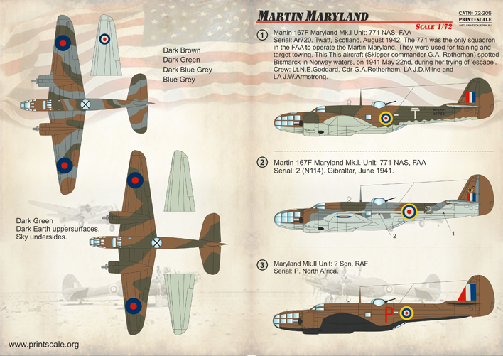 1. Martin 167F Maryland Mk.I Unit: 771 NAS, FAA. Serial: Ar720. Twatt, Scotland, August 1942. The 771 was the only squadron in the Faa to operate the Martin Maryland. They were used for training and target towing. This This aircraft (Skipper commander G.A. Rotherhan) spotted Bismarck in Norway waters, on 1941 May 22nd, during her trying of 'escape'. Crew: Lt.N.E.Goddard, Cdr G.A.Rotherham, La J.D.Milne and La J.W.Armstrong.
