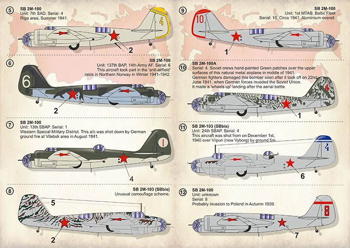 1. SB-2M-100A Serial: '0' . Advancing German troops captured this late production SB 2M-100A in the Summer 1941. It is camouflaged in Medium Green upper surfaces and Light Blue undersurfaces.