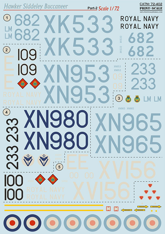 5. Blackburn Buccaneer S.2. Xv 156/ E-100 of 800 Squadron. Gloss extra dark sea grey upper surfaces with experimental colour scheme. Dark sea grey was over-painted on white resulting in what appears to be two tones of grey. Serial number , Royal Navy titles and fin letters are white. Squadron crest displayed on diamond on nose section.