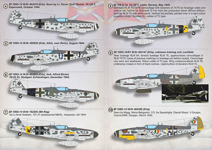 8. Bf-109G-14, 15./JG 5, Lister, Norway, May 1945. Standard Rlm 74/75/76 camouflage with blotches of 74/75 on fuselage sides and vertical tail, typical for Erla-built G-14s from the production block 460xxx-462xxx. Spinner Rlm 70 with white spiral. Vertical tail partially painted over in a light colour (possibly white). Wooden fin, rudder of T2 type.