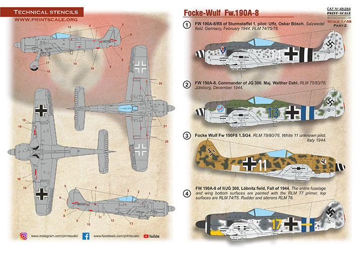 Print Scale - 1/48 Focke-Wulf Fw-190A-8 Part 2 1. Fw-190A-8/R8 of Sturmstaffel 1, pilot: Uffz, Oskar Bösch, Salzwedel field, Germany, February 1944.2. Fw-190A-8. Commander of Jg 300. Maj. Walther Dahl. Rlm 75/83/76. Jüteborg,December 1944.3. Focke-Wulf Fw-190F8 1.SG4. Rlm 79/80/76. White 11 unknown pilot Italy 1944.4.Fw-190A-8 of ll/JG 300, Löbnitz field, Fall of 1944. The entire fuselage and wing bottom surfaces are painted with the Rlm 77 primer, top surfaces are Rlm 74/75. Rudder and ailerons Rlm 76.