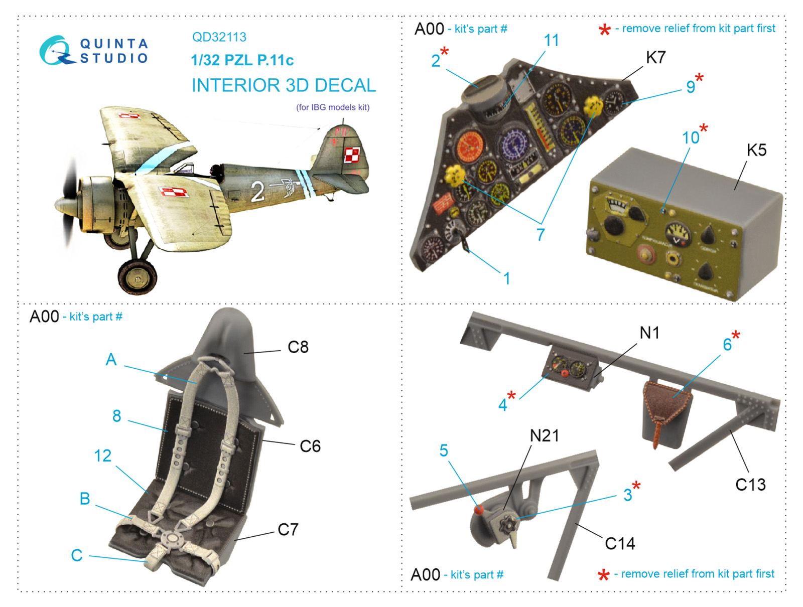 Quinta Studio - 1/32 Pzl P.11c 3D-Printed & coloured Interior on decal paper (for Ibg Model kits)