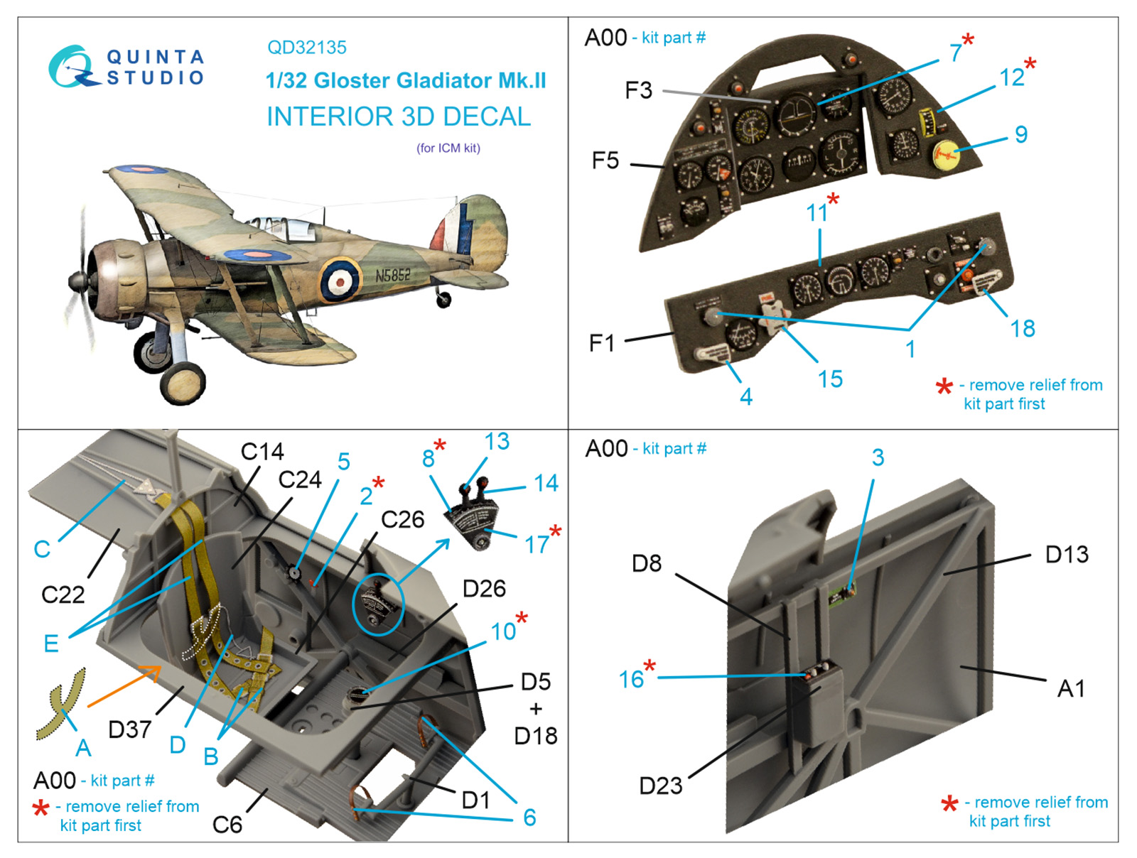 Quinta Studio - 1/32 Gloster Gladiator Mk.II 3D-Printed & coloured Interior on decal paper (for Icm kits)