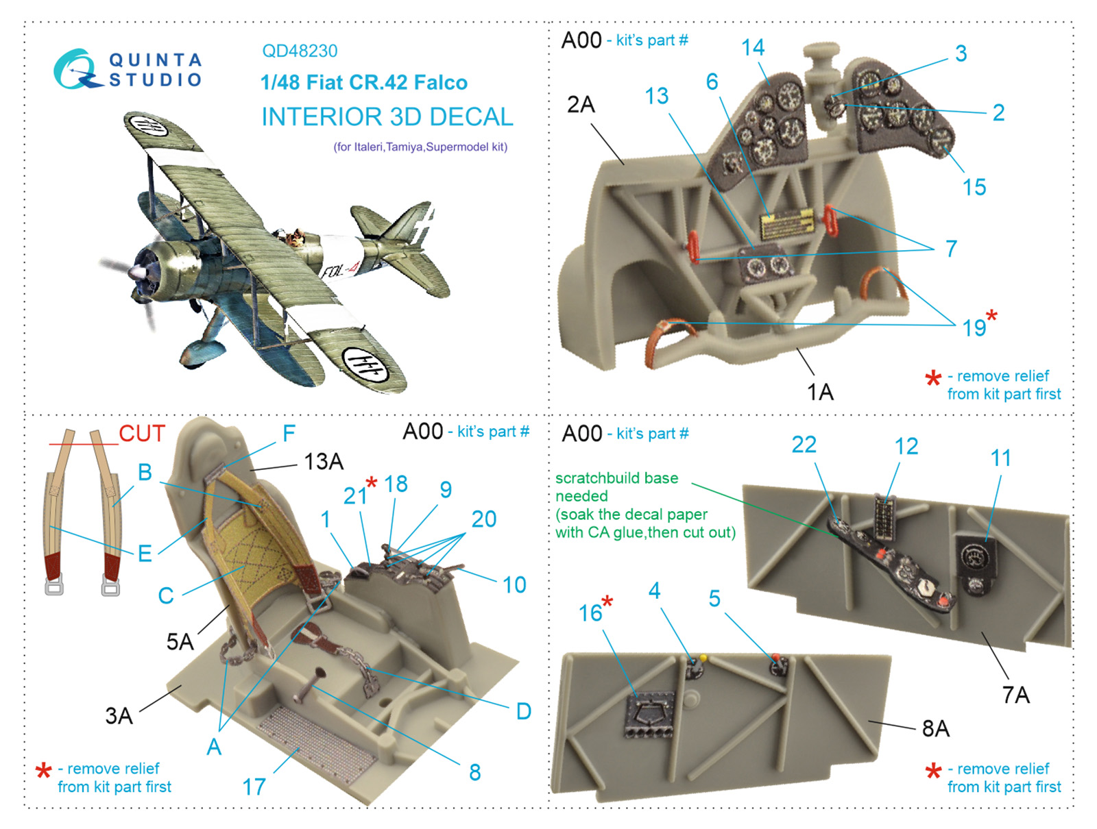Quinta Studio - 1/48 Fiat CR.42 Falco 3D-Printed & coloured Interior on decal paper (for Italeri kits)