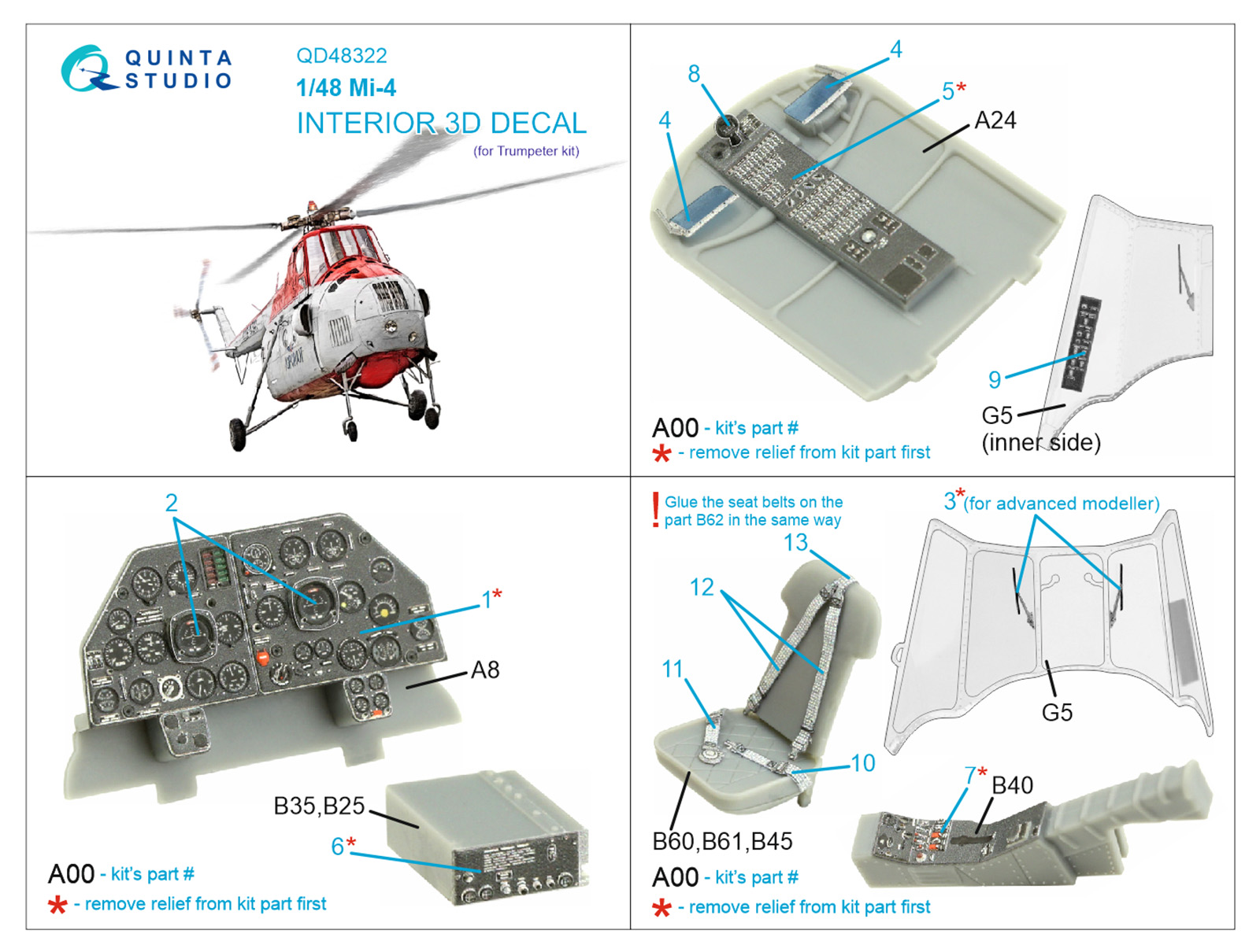 Quinta Studio - 1/48 Mil Mi-4 3D-Printed & coloured Interior on decal paper (for Trumpeter kits)